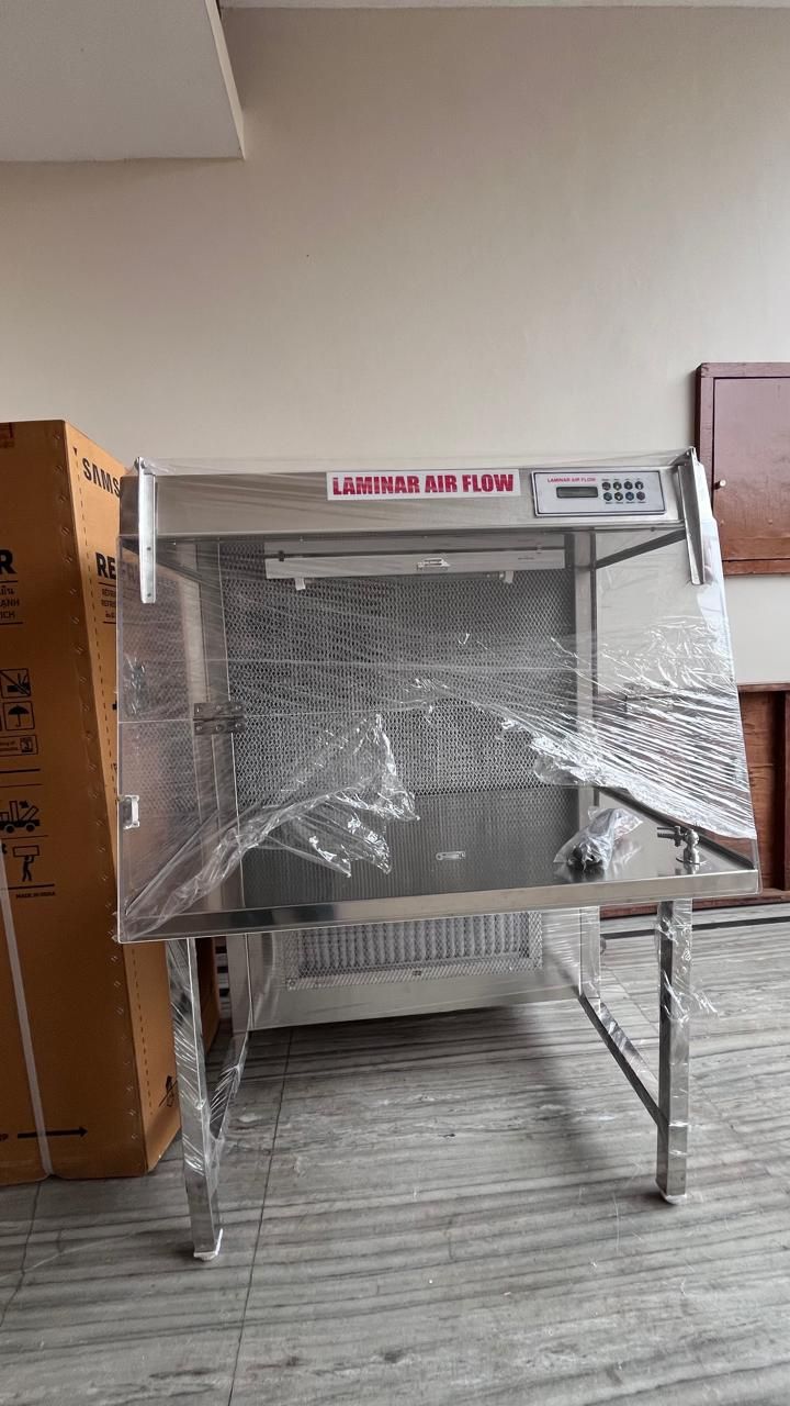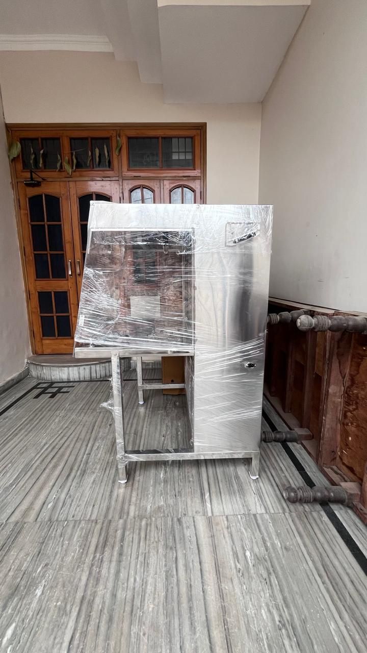 Size 95x50x50 cms with sloping front. Acrylic sheet front and side doors (full visible Transparent) 3' germicidal ultraviolet tube and 2' fluorescent tube for white light with necessary choke blast, starter and switches fitted. Also main lead and plug provided. Two holes with rings and sieves for insertion of arms provided.